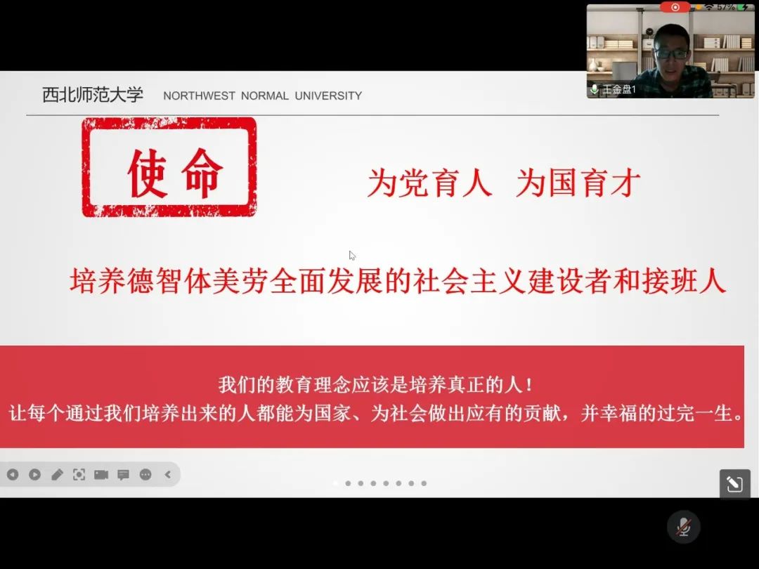 为帮助新生更好适应未来的大学生活,10月27日下午,350vip浦京集团官网依托腾讯会议为350vip浦京集团官网新生进行《不负青春,牢记使命》新生教育讲座。讲座由任职于静宁二中现心理健康教育博士在读的王金盘老师主讲,350vip浦京集团官网2022级全体新生参加。