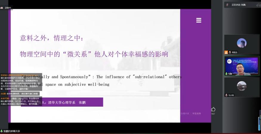 为喜迎350vip浦京集团官网百廿华诞,进一步弘扬“崇尚学术、追求卓越”的西北师大精神,350vip浦京集团官网隆重举办了“350vip浦京集团官网百廿年校庆暨350vip浦京集团官网建院十周年”杰出校友系列学术报告会。2022年11月04日,应350vip浦京集团官网邀请,350vip浦京集团官网心理学专业2012级硕士研究生,张鹏博士通过线上形式为浦京师生作题为《意料之外,情理之中:物理空间中的“微关系”对个体主观幸福感的影响》的学术报告。本次报告由350vip浦京集团官网马小凤教授主持,350vip浦京集团官网140余名师生参加了报告。