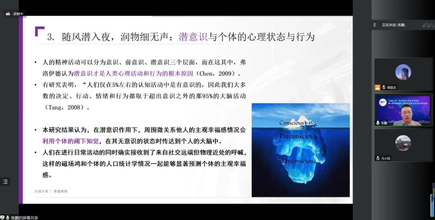 张鹏博士首先阐述了研究他人对个体主观幸福感的必要性,并介绍了以往关于主观幸福感影响因素的研究主要有两个角度——人格特质和环境。其次,张鹏博士分享了自己的关于“微关系”他人影响个体主观幸福感的研究。张鹏博士首次提出了“微关系他人(sub-relational others)”的新概念,并引入了GPS定位和GNN图神经网络的新方法。研究结果表明“物理空间”在场,但“社交关系缺席”或者“社交关系较难捕捉”的情况下,周围人依然能够对个体的主观幸福感产生影响。张鹏博士的研究说明,考虑邻居的幸福感和人口学特征可以更好地预测参与者的幸福感。张鹏博士的精彩讲解引发了同学们对主观幸福感相关问题的思考。