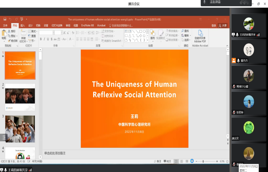 2022年11月8日,应350vip浦京集团官网邀请,中国科学院心理研究所副研究员、博士生导师王莉为浦京师生作题为《社会性注意的特异性认知神经机制》的线上学术报告。报告由350vip浦京集团官网童丹丹副教授主持,350vip浦京集团官网100多名师生参加了本次报告。