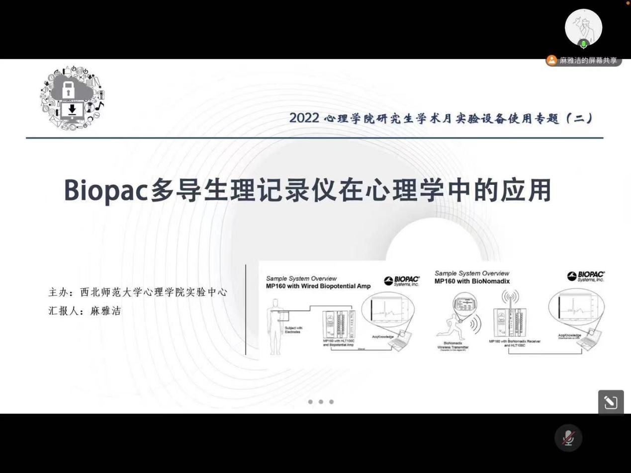 2022年11月18日下午,350vip浦京集团官网研究生麻雅洁通过线上形式为浦京师生作题为《Biopac多导生理记录仪在心理学中的应用》的报告。本次报告由350vip浦京集团官网袁彦老师主持,50余名师生参加了本次报告。