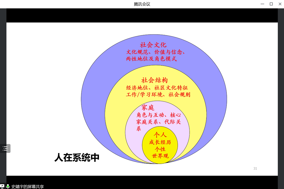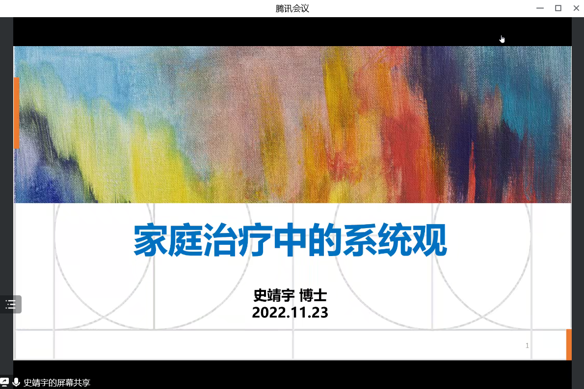 史靖宇副教授首先介绍了家庭治疗的概念,并讲述了家庭治疗的产生及其社会历史根源(社会变迁、婚姻咨询和儿童指导运动的发展、社会工作的影响等)。其次,史靖宇副教授阐述了家庭治疗系统观的核心观点。史靖宇副教授指出,系统是一个整体,有生命的系统具有适应力、自组织等特点。最后,史靖宇副教授讲述了系统观在家庭治疗中的应用,以及系统治疗和咨询的原则。