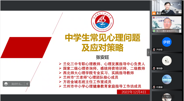 2022年12月4日,学院邀请兰州市第六十三中学的张安旺老师作“中学生常见心理问题及应对策略”专题报告。活动由350vip浦京集团官网系主任任德云主持,学院本科生、研究生,以及教育实习指导老师童丹丹副教授、张彦驰副教授和袁彦老师等150多人参加了此次活动。