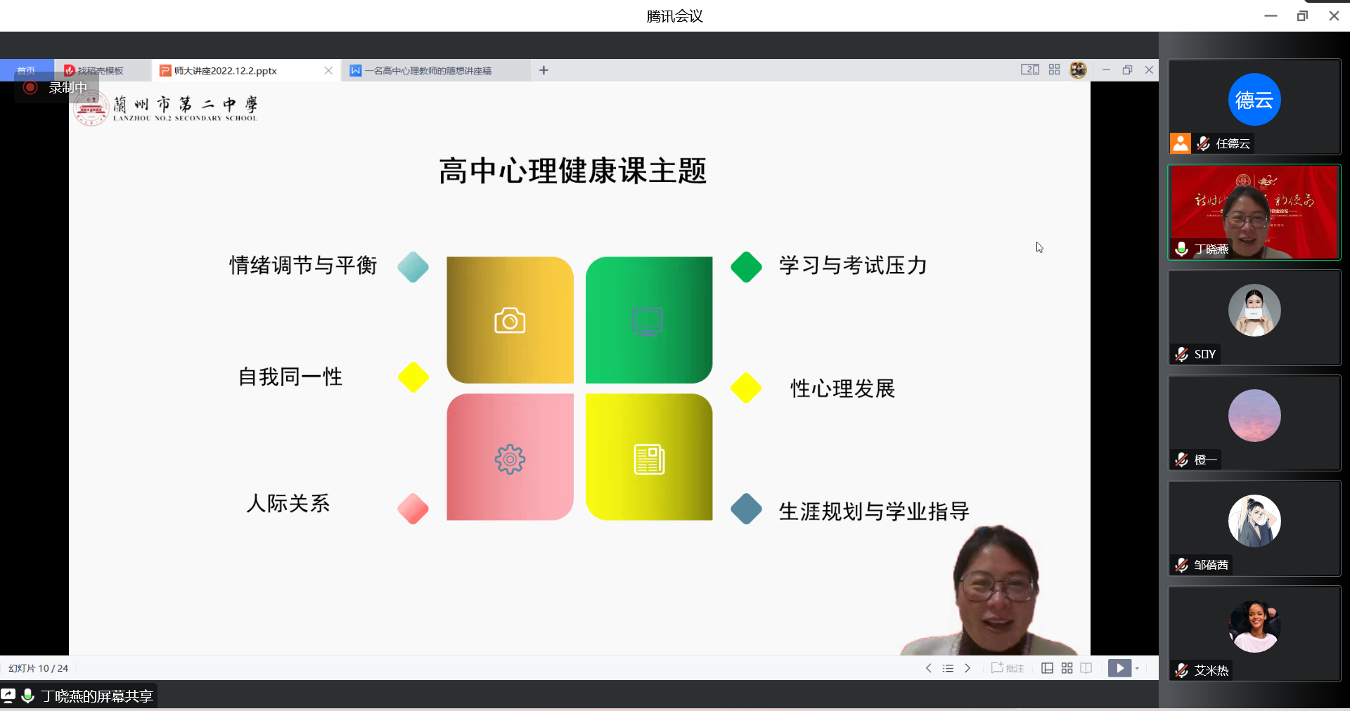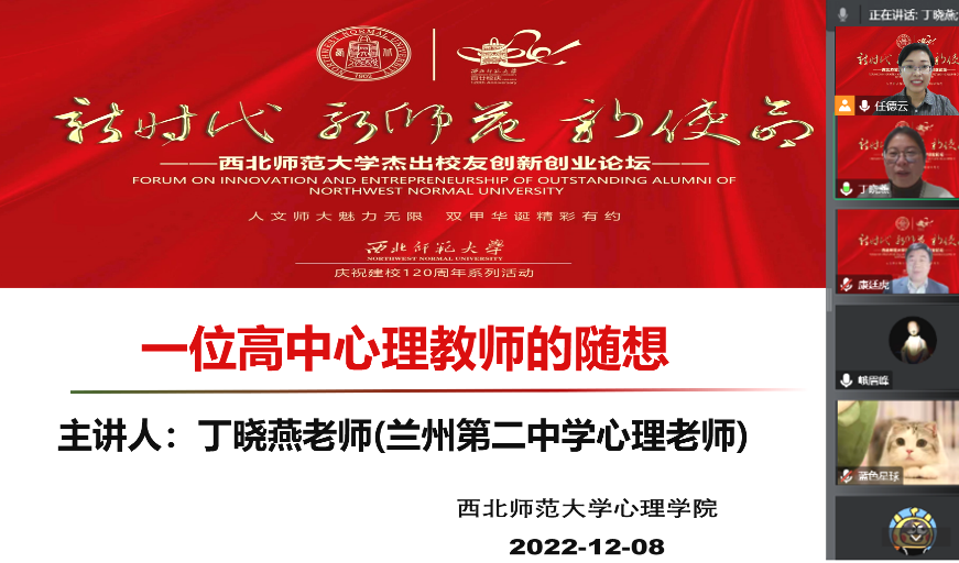 为了培养心理学专业本科生、研究生的实践能力,推进创新创业工作,学院组织校友创新创业论坛系列专题报告。2022年12月8日,学院邀请兰州市第二中学的丁晓燕老师为学院师生及心理学从业者做了题为“一位高中心理教师的随想”的报告。活动由350vip浦京集团官网心理系系主任任德云主持,甘肃省教育科学研究院教研员何宝平老师、学院副院长康廷虎老师和教育实习指导教师高鑫老师、童丹丹老师、袁彦老师等180多名师生参加了活动。