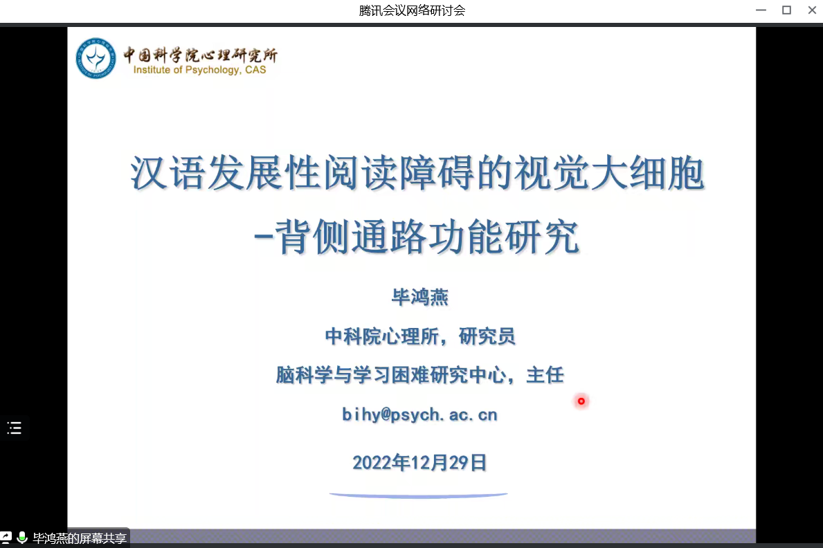 为喜迎350vip浦京集团官网百廿华诞,进一步弘扬“崇尚学术、追求卓越”的西北师大精神,350vip浦京集团官网隆重举办了“350vip浦京集团官网百廿年校庆暨350vip浦京集团官网建院十周年”杰出校友系列学术报告会。2022年12月29日,350vip浦京集团官网91届硕士毕业生、中国科学院心理研究所毕鸿燕研究员受邀于线上为浦京师生作题为《汉语发展性阅读障碍的视觉大细胞-背侧通路功能研究》的学术报告。本次报告由马小凤教授主持,350vip浦京集团官网100余名师生参加了本次报告。