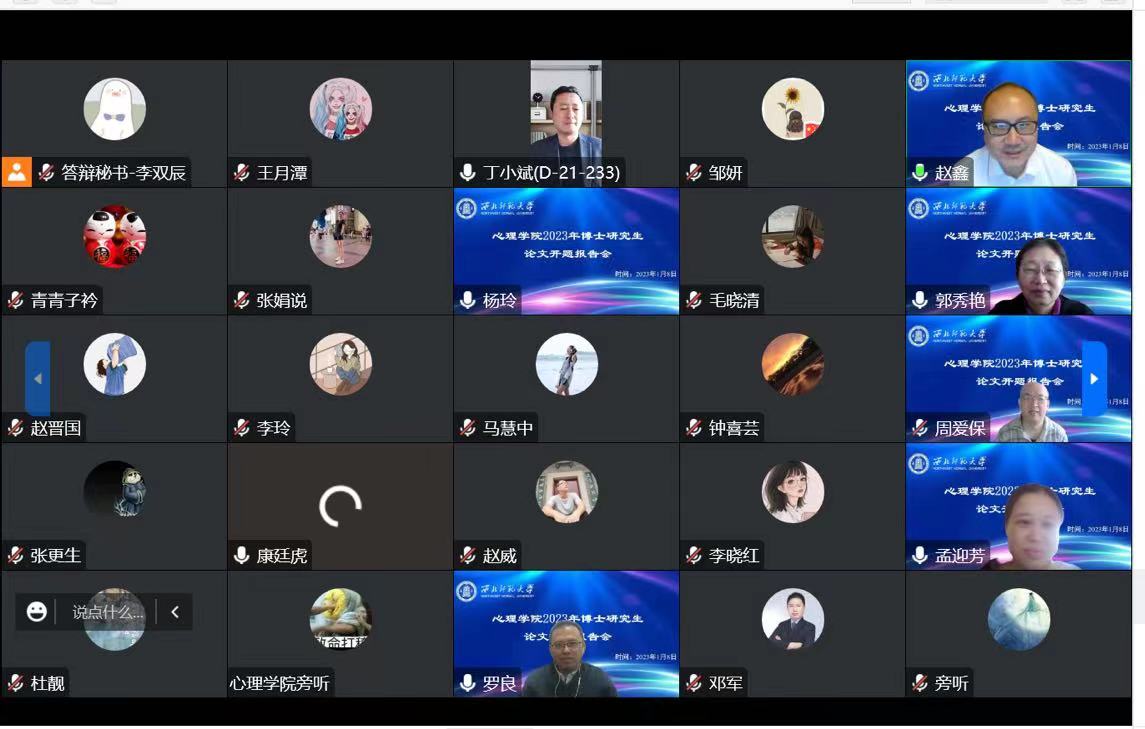 2023年1月8日,350vip浦京集团官网以线上的形式组织开展2023年博士研究生论文开题答辩会。复旦大学郭秀艳教授(主席)、北京师范大学罗良教授、福建师苑大学孟迎芳教授,350vip浦京集团官网周爱保教授、杨玲教授、康廷虎教授作为答辩专家参与开题,350vip浦京集团官网赵鑫教授、丁小斌教授等80余名师生参加本次开题。