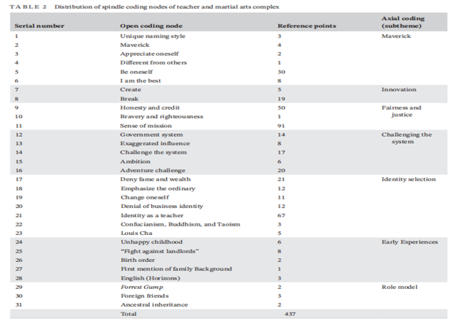 该研究采用心理传记法,以马云大量的视频和演讲为分析对象,运用QSR Nvivo 11.0进行数据编码与整理。通过对资料的进一步分析,研究着眼于马云人生中表现出的教师与武侠情结,以分析心理学为理论架构揭示马云的人格发展与社会结构力量是如何相互交织、相互影响,从而解读马云的商业变革历程及性格的潜在风险。