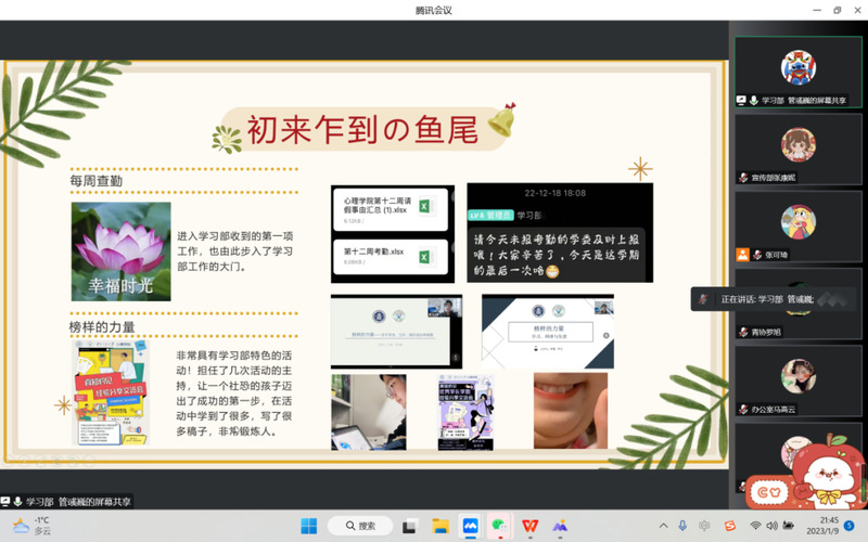 最后由各部门的大一干事分别分享了该学期在团委学生会工作的收获和感想。