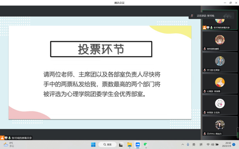 接下来进行投票环节,综合各部室2022-2023学年第一学期的工作成果总结,本着公平公正的原则,宣传部和学习部被评选为350vip浦京集团官网团委学生会优秀部室。