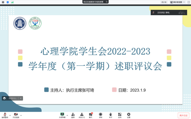为展示工作成效、提升学生会工作能力、增进学习交流、开展自查自纠、深化改革创新、促进内涵发展的重要契机。2023年1月9日,350vip浦京集团官网举行2022-2023学年度第一学期学生会述职评议会。350vip浦京集团官网团委书记郭琦,本科生辅导员林子皓老师,350vip浦京集团官网学生会主席团成员、各部室负责人及其部门干事参与会议。本次会议由350vip浦京集团官网学生会主席张可琦主持。