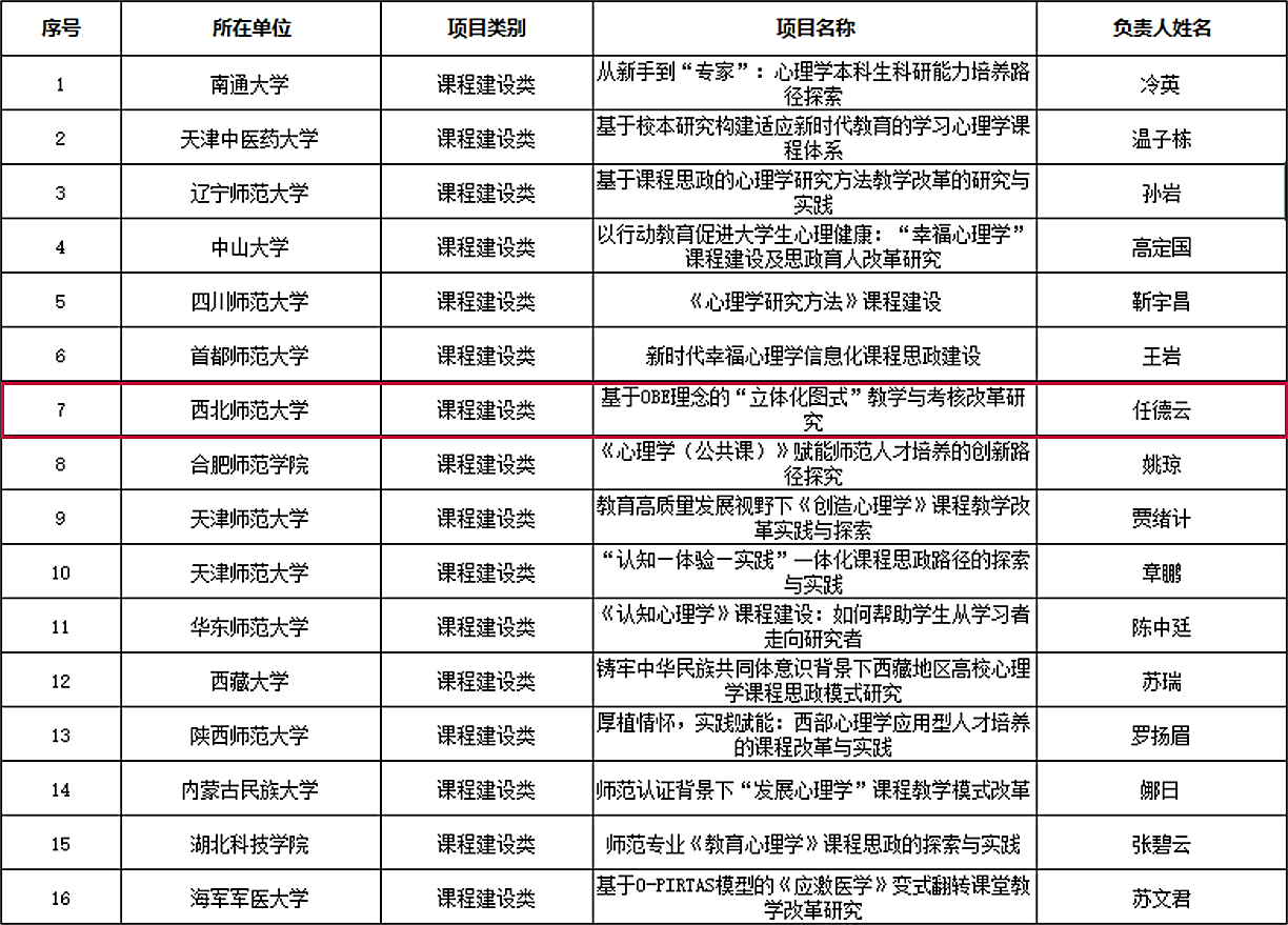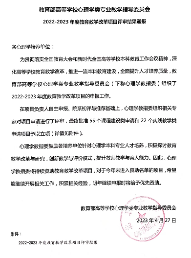 为贯彻落实全国教育大会和新时代全国高等学校本科教育工作会议精神,推进一流本科教育建设,深化高等学校教育教学改革,全面提升人才培养质量,教育部高等学校心理学类专业教学指导委员会于2022-2023年度批准立项55个课程建设类和22个实践教学类教学改革项目。学院任德云老师负责的项目“基于OBE理念的‘立体化图式’教学与考核改革研究”获课程建设类教改项目立项。