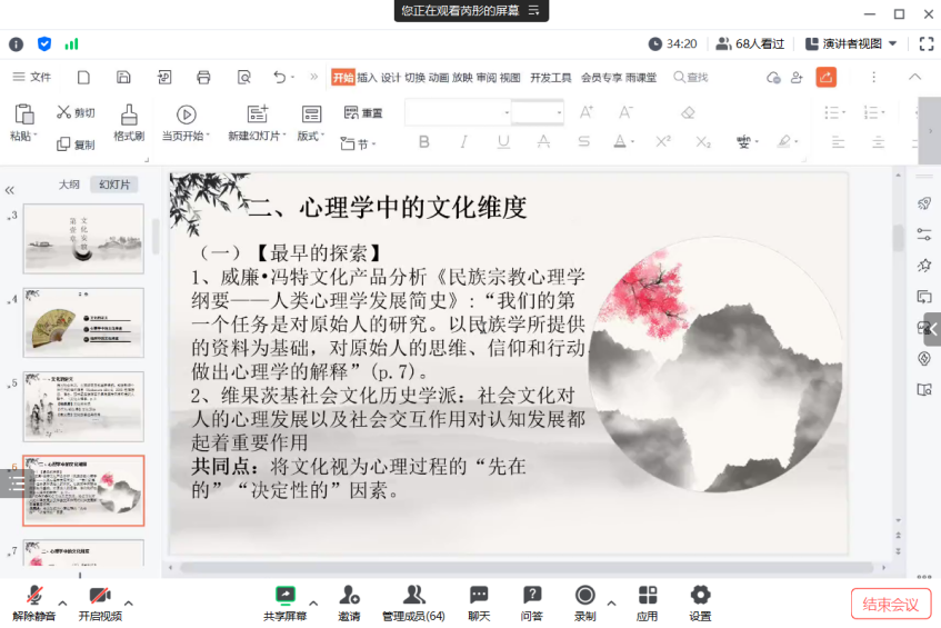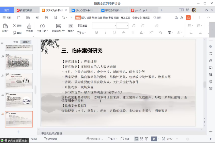 在本次讲座中,郭老师首先为大家科普了文化的定义以及心理学和临床中的各种文化维度。接着,郭老师介绍了什么是案例,为什么选择案例研究,以及临床案例研究的特征。然后,郭老师强调了案例研究的伦理事项。最后,郭老师通过列举自己的研究让大家对案例研究有了进一步的理解。