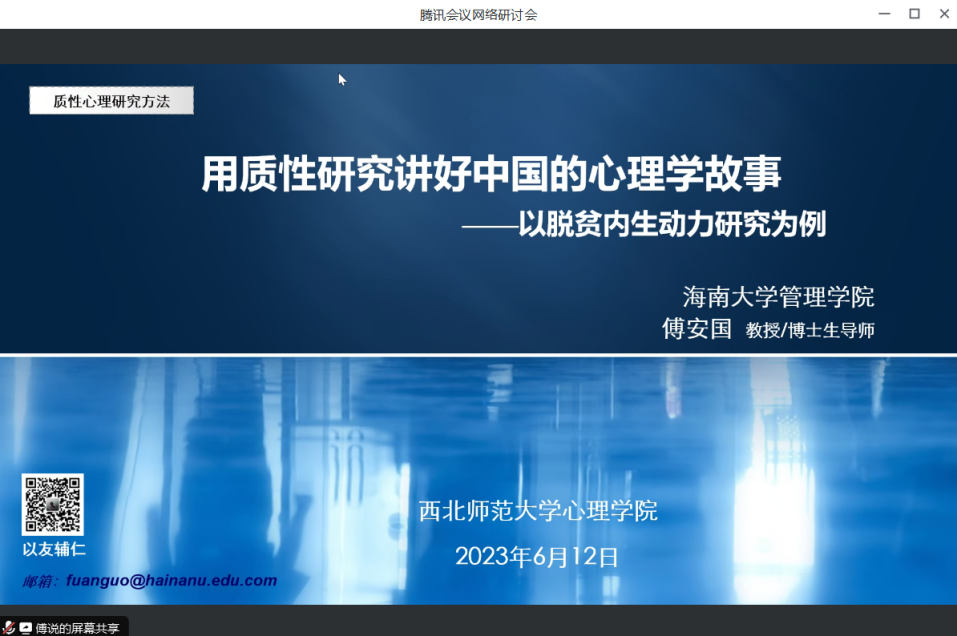 2023年6月12日,应350vip浦京集团官网邀请,海南大学傅安国教授以线上方式为浦京师生作题为《用质性研究讲好中国的心理学故事》的学术报告。本次报告由350vip浦京集团官网朱雅雯副教授主持,共100余名师生参加了本次报告。
