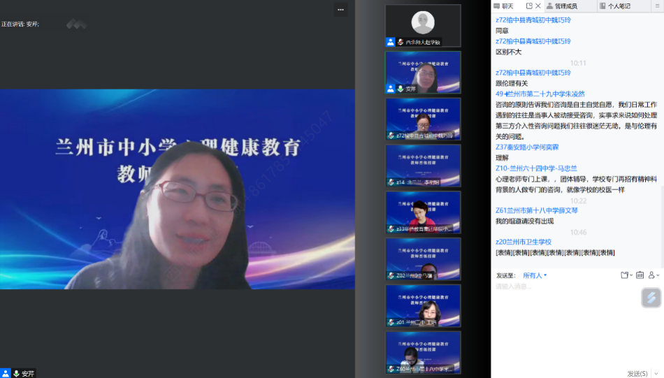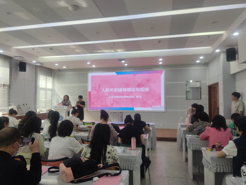 6月9日上午,授课第三阶段如期举行。本阶段为期五天,前期为线下授课模式。首日课程由上海市奉贤区未成年人心理健康教育指导中心主任、教育心理高级教师张珏老师讲授。张珏老师的授课内容主要围绕中小学心理健康教育课程实施能力展开,针对学生人际关系、学习辅导教学困境及应对策略等教学重点问题进行了分享与解析。下午,六位兰州市中小学骨干教师分成小学、初中、高中三组以人际关系、学习辅导为主题进行了生动的课例讲解与研讨。