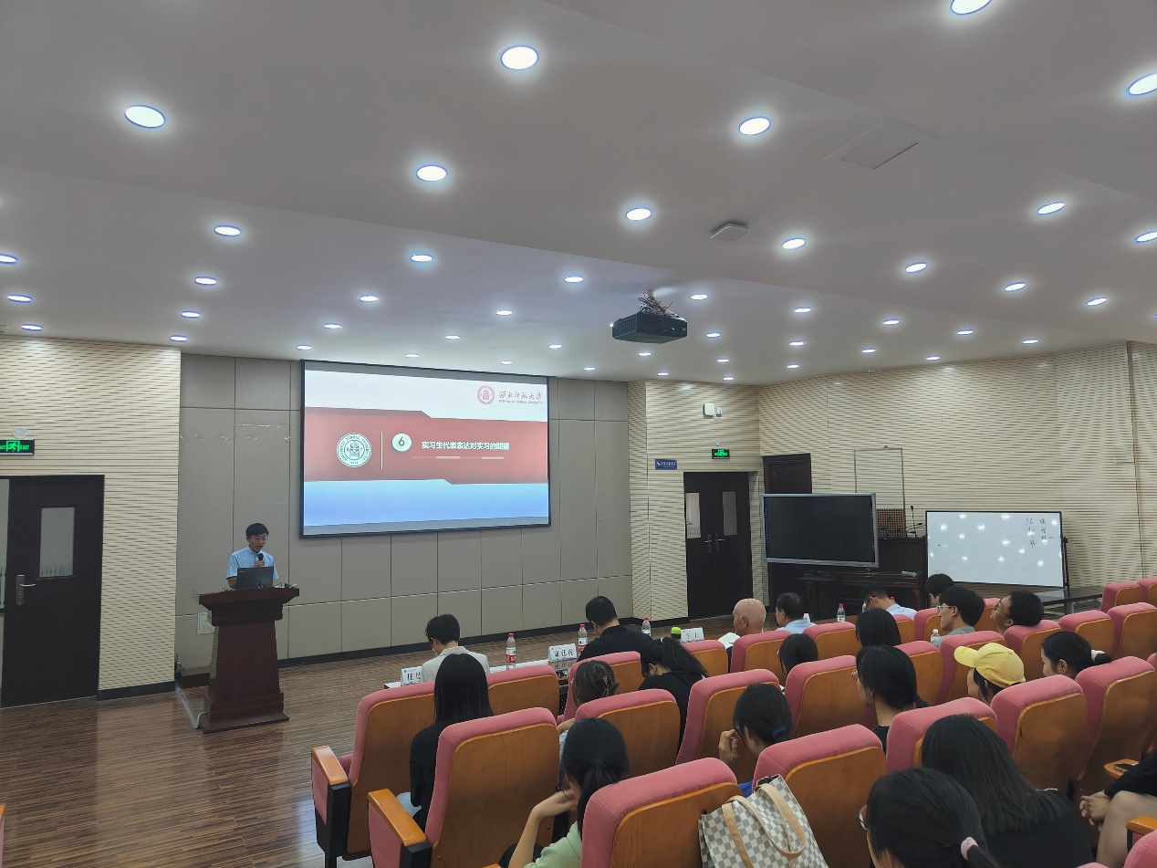 最后,实习生代表2020级应用心理二班席树仁同学发言。他感谢学院在实习基地建设、实习指导教师安排等方面做的工作,同时,他也对未来的实习充满期待,相信同学们通过实习,能够获得更大得进步和成长。