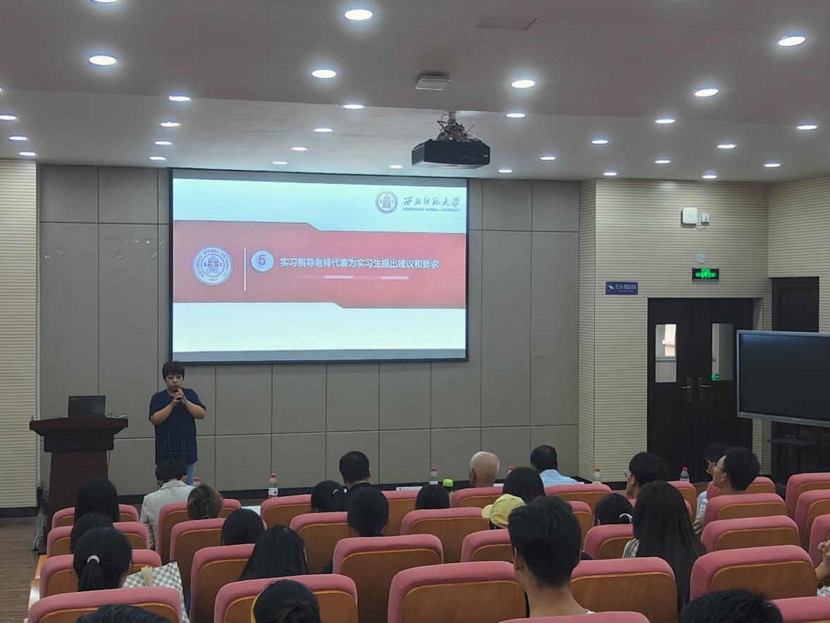 会上还邀请了实习指导教师姜艳斐副教授为即将进入到实习学校的实习同学提出实习建议和要求。比如在实习过程中要遵守实习学校的管理、认真完成各项实习工作,以及形成实习小组、分享实习经验等。