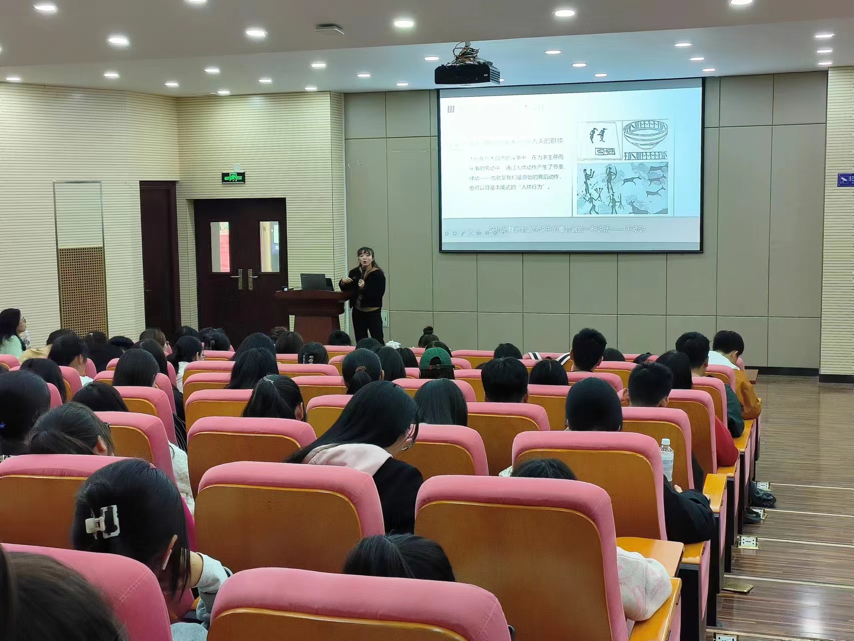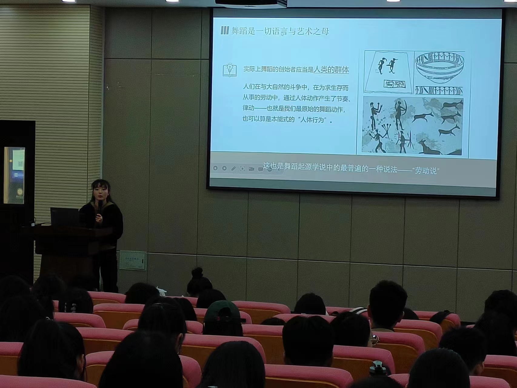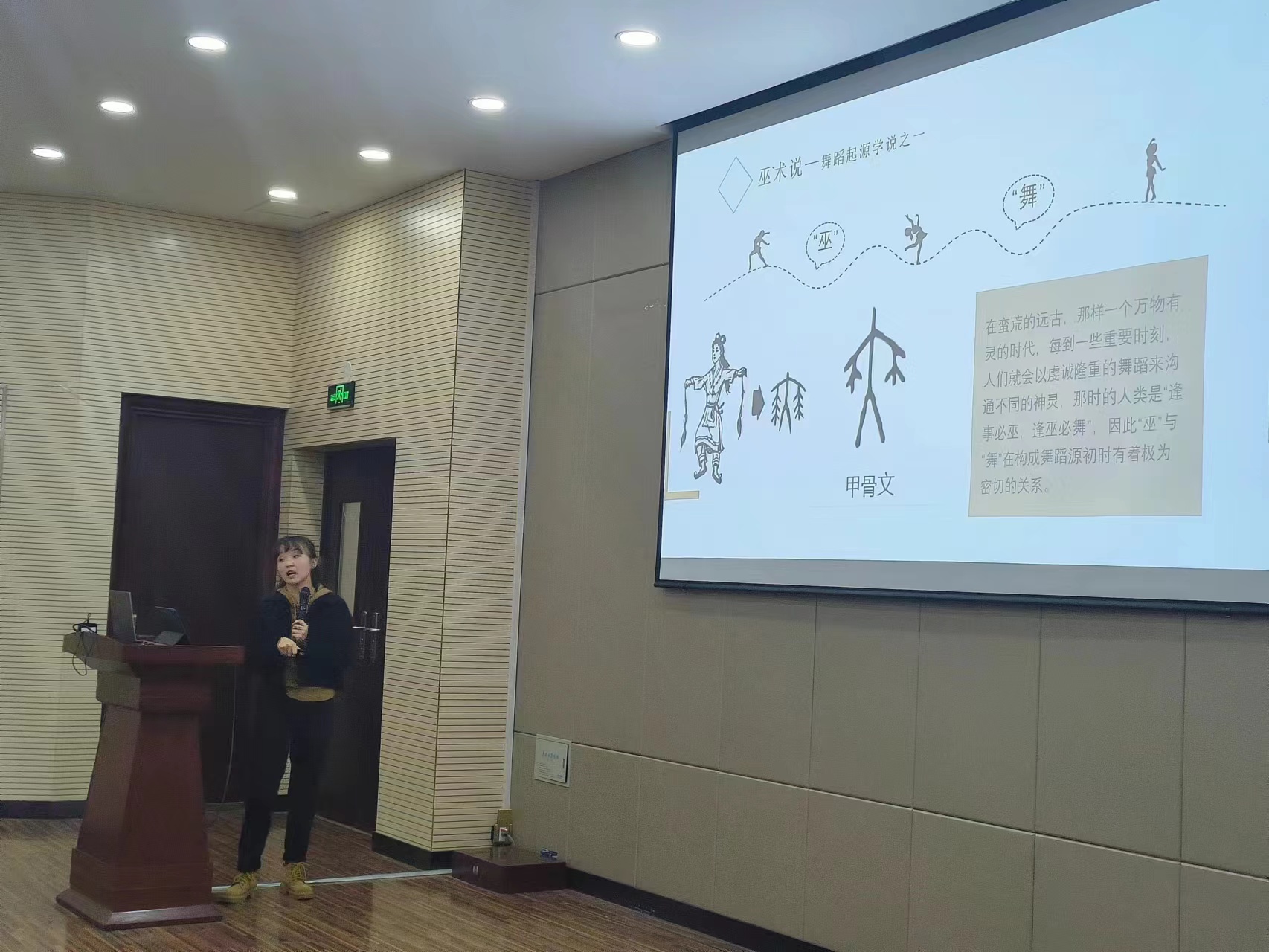 报告由“什么是舞蹈”这一问题展开。作为艺术之母的舞蹈究竟起源于何时,有多长时间的历史呢?王老师接着问题向同学们展示了原始舞蹈遗存:云南沧源岩画,左江崖壁画等,通过讲述其背后的历史故事让同学们感受到了舞蹈古老的魅力。