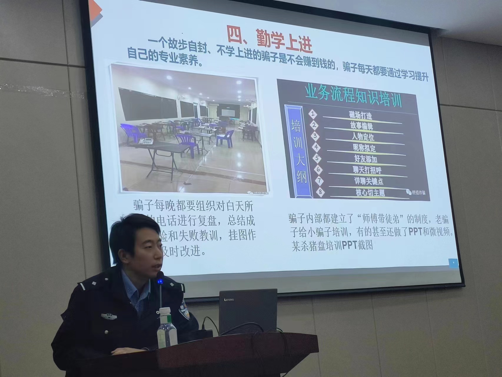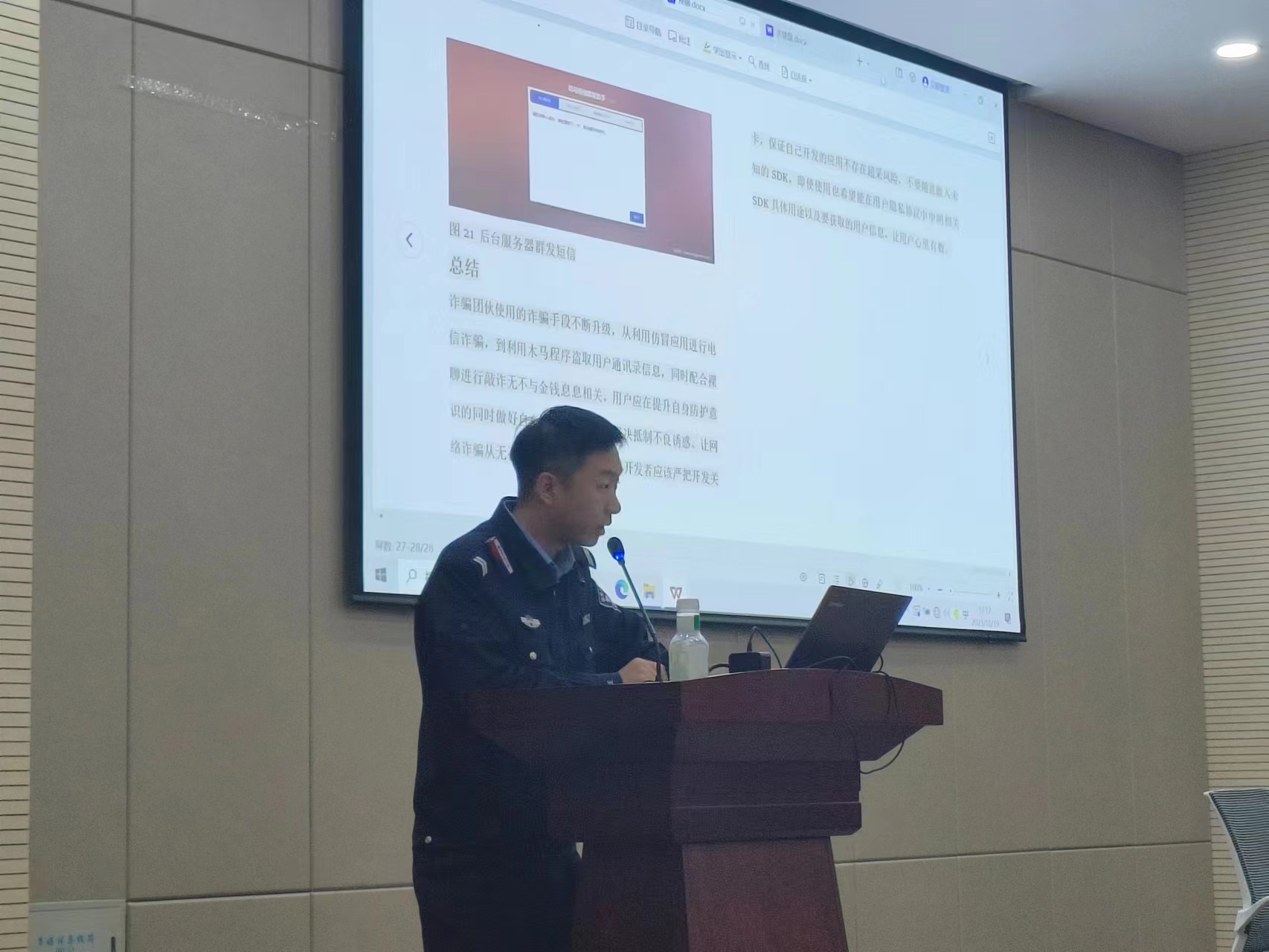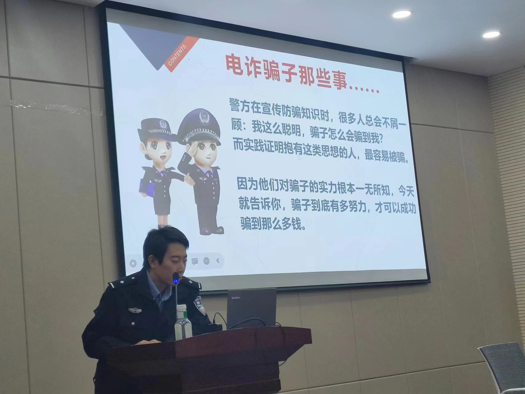 在此次反诈安全主题的教育活动中,何警官和郜警官带领大家认识了电信诈骗的类型和典型案例,向大家讲述了仿冒身份诈骗,“杀猪盘”刷单,网络赌博等诈骗手段的特点,揭露了在诈骗中常用的话术,教导大学生如何处理类似案件。何警官和郜警官还以典型案例为教育范本让我们意识到电信诈骗的狡猾危险,看到社会上被电诈伤害到的千千万万的家庭,更以此提高了我们的反诈意识和在网络生活中的警觉意识,谨防电信诈骗,保护好个人人身财产安全。