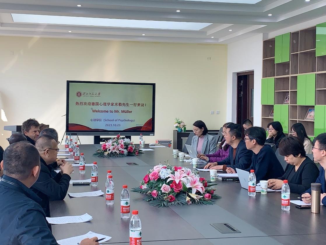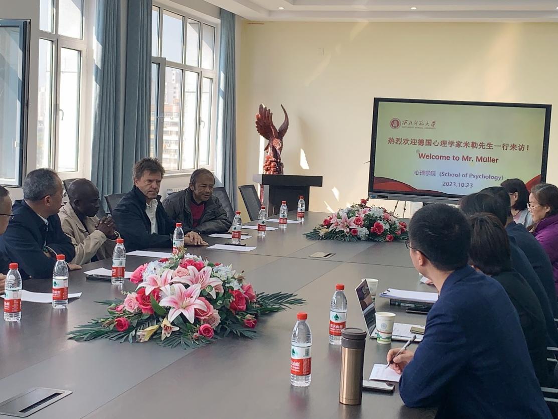 会上,赵振文对米勒先生及本次访问和交流的背景进行介绍。米勒先生是世界著名的心理学研究专家,德国联邦政府特聘心理研究员,“马丁·路德”特教学校校长,德国“凯斯汀·嗨姆”青少年心理健康帮助中心负责人。期待通过本次访问350vip浦京集团官网,共商搭建德语教学平台,为持续稳定开展中德合作,奠定基础。