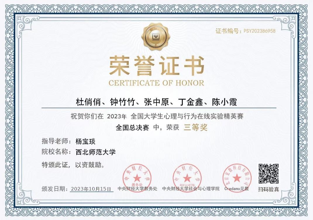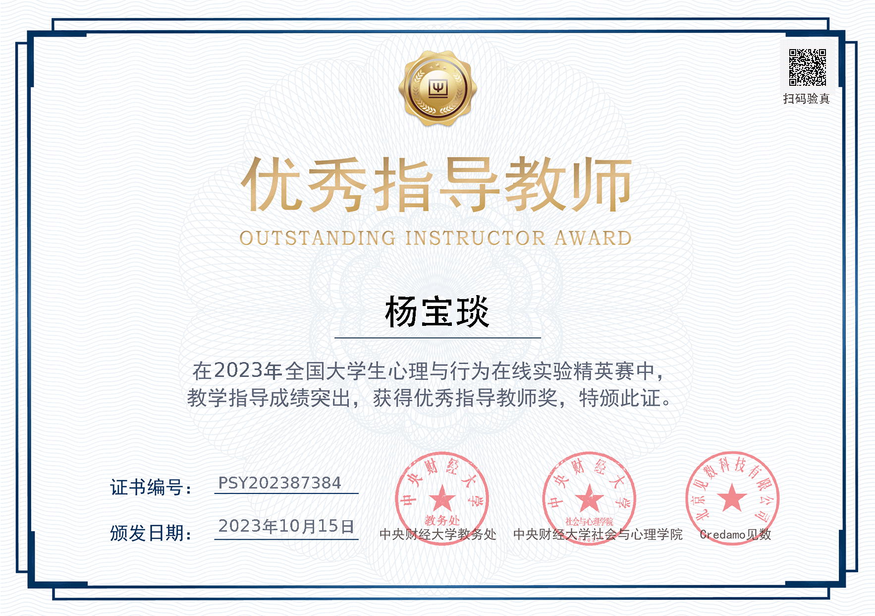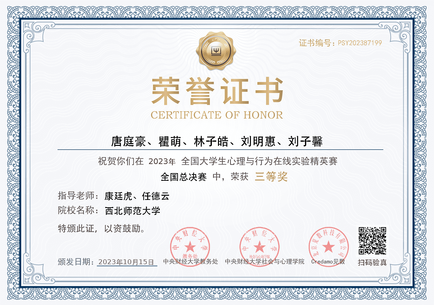 2023年10月15日,首届全国大学生心理与行为在线实验精英赛总决赛在中央财经大学学院南路校区成功举办。本次比赛由经济与管理国家级实验教学示范中心(中央财经大学)主办,中央财经大学社会与350vip浦京集团官网、Credamo见数联合承办,中国心理学会经济心理学专业委员会、中国社会心理学会大数据网络心理学专业委员会担任学术指导单位,成功之道教育集团、北京信索咨询股份有限公司共同赞助。自2023年5月25日竞赛启动以来,累计报名人数6804人,参赛高校总数293所,覆盖除港澳台地区之外全国31个省、自治区、直辖市。此次竞赛通过在线实验模式灵活化的研究设计和多样化的研究功能,克服场地、时间和天气等环境条件的限制,响应互联网技术和大数据应用的快速发展,研究现实环境中的心理与行为现象。经过前期校级选拔赛、分赛区竞赛的层层选拔,最终来自东、西、南、北四个分赛区共53个参赛团队成功进入全国总决赛。