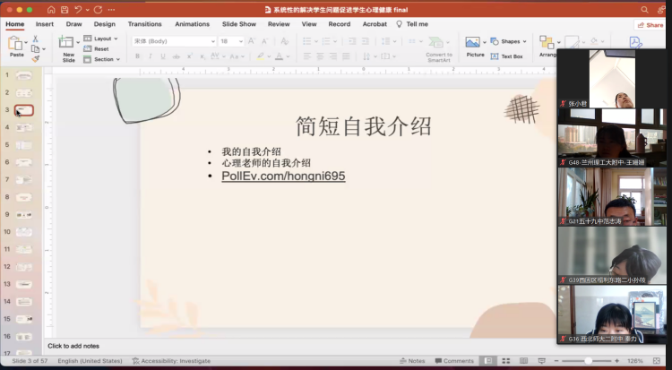 11月3日上午,授课第一阶段正式开始。首日课程由内布拉斯加大学林肯分校教育心理学博士、加州州立大学福莱斯诺分校心理系教授倪虹老师进行线上授课,倪老师用丰富的经验和知识为学员分享了关于如何解决学生心理问题以及进一步促进学生的心理健康的相关内容。