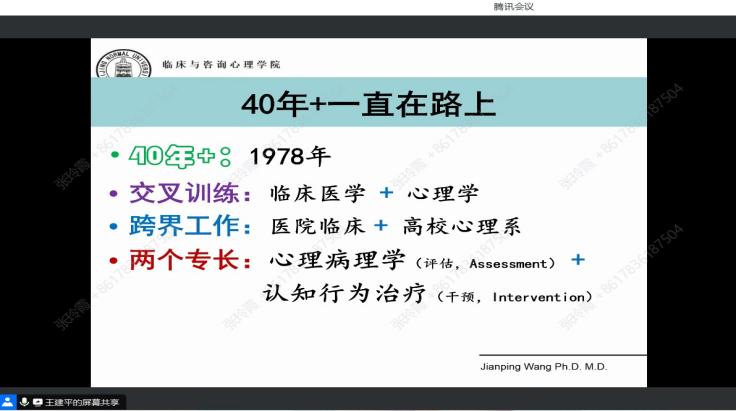 11月8日晚上,北京师范大学二级教授、博士生导师、北京师范大学心理学部临床与咨询350vip浦京集团官网副院长王建平老师为学员进行线上授课,王老师分享了认知行为疗法的概述,使学员对这一疗法有初步认识,更新了学员的知识系统。