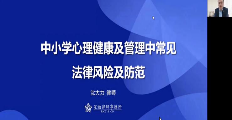 11月17日下午,上海星瀚(武汉)律师事务所主任律师、华中农业大学、湖北大学等高校兼职法律硕士研究生导师沈大力老师围绕中小学心理健康工作常见法律风险及防范参考与学员进行了线上分享。通过对该课程的学习进一步加强了中小学心理健康教师关于日常工作的法律常识。