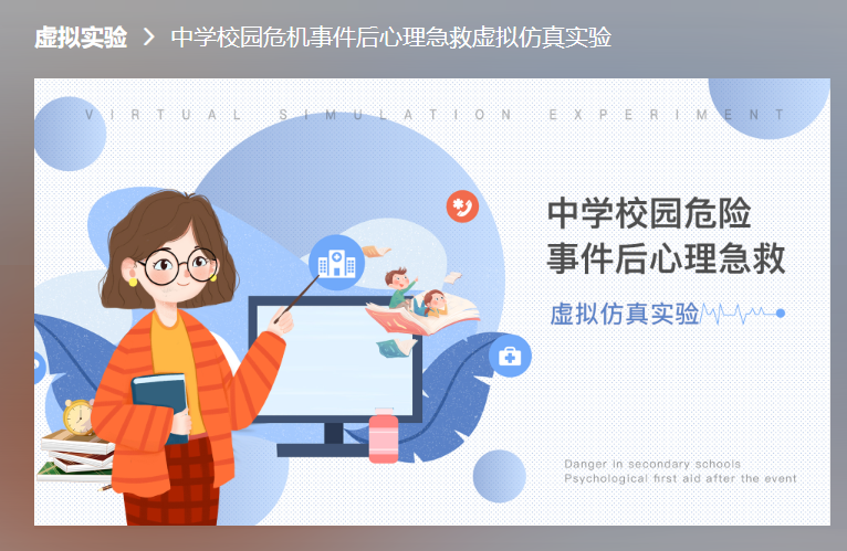 《中学校园危机事件后心理急救》虚拟仿真实验教学课程,是2022年度由学校立项、学院支持建设的校级一流虚拟仿真课程培育项目。该项目由学院姜艳斐副教授主持建设,2023年1月学校国资处组织招标,由上海卓越睿新数码科技股份有限公司提供课程所需要的技术服务。
