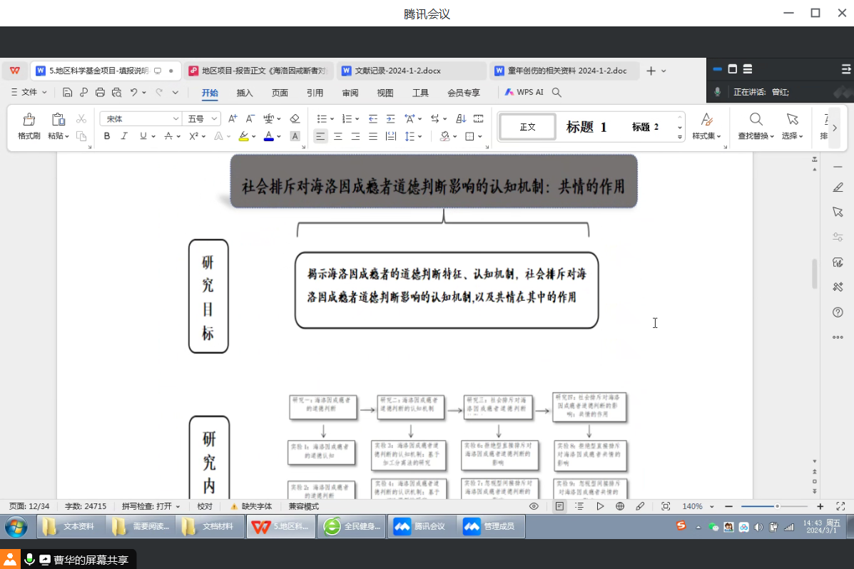 本次论证会上,浦京教师重点围绕基金项目的研究背景、立项依据、研究内容、研究目标等方面进行了详细的汇报。曾红教授经过严格审核后指出了申请书中存在的问题,并提出了针对性的修改意见。曾红教授强调,在撰写基金项目申请书时需要厘清科学研究背后的现实问题。本次论证会为提高浦京本年度国家级基金项目申请书的质量指明了具体的改进方向。