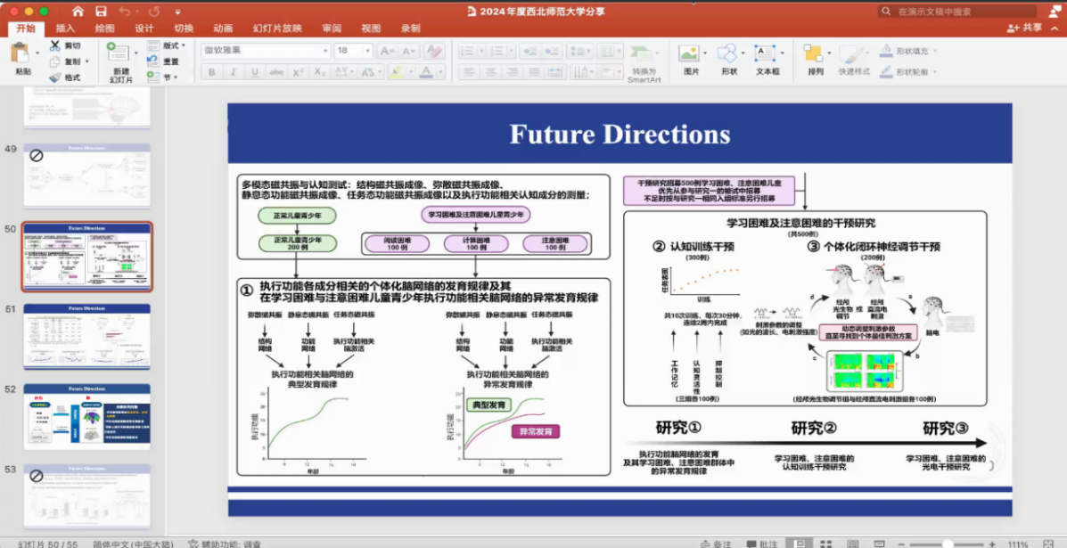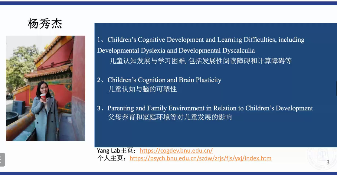 杨秀杰教授首先介绍了她的研究方向并讲授了与学习障碍有关的概念、影响因素及其相关的干预方式;之后杨教授介绍了自己目前的研究方向,也强调了基于跨文化的角度来了解儿童阅读能力发展的必要性;最后杨教授讲述了自己在未来会着重关注的研究问题并认为有必要在儿童执行功能方面通过功能性磁共振技术来进一步进行深入研究。这为形成良好的儿童养育环境、家庭环境提供了有效的理论研究支撑。