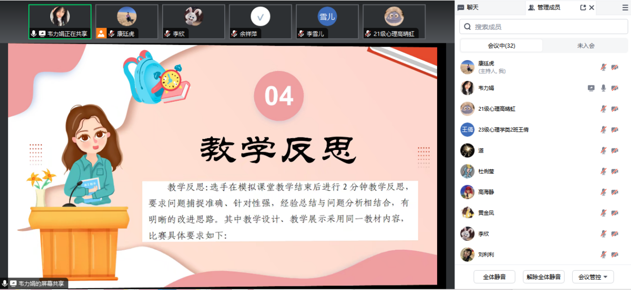 在教学展示过程中,要注意课件制作、板书设计,特别是在模拟授课环节要注意语言表达、时间管理等。最后,她也分享了自己对教学反思的理解,以及教学反思过程应该注意的问题。
