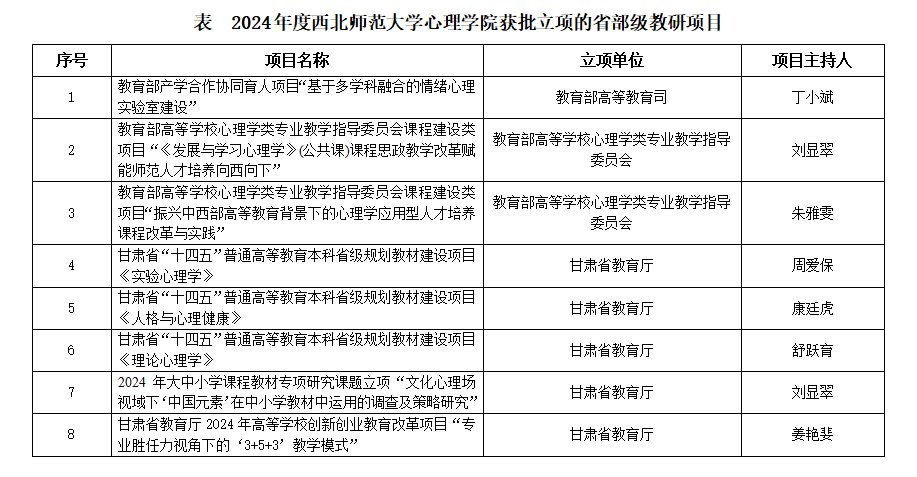 丁小斌教授申报的“基于多学科融合的情绪心理实验室建设”获批教育部产学合作协同育人项目,刘显翠副教授、朱雅雯副教授申报的“《发展与学习心理学》(公共课)课程思政教学改革赋能师范人才培养向西向下”“振兴中西部高等教育背景下的心理学应用型人才培养课程改革与实践”分别获得教育部高等学校心理学类专业教学指导委员会课程建设类项目立项,周爱保教授、康廷虎教授、舒跃育教授主持建设的《实验心理学》《人格与心理健康》《理论心理学》分别获批甘肃省“十四五”普通高等教育本科省级规划教材建设项目。