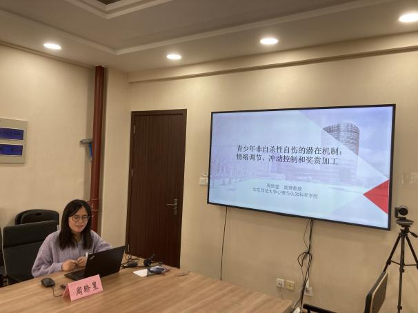 随后,浦京青年教师刘晓婷、潘超超分别做了《遗传基因与环境对青少年睡眠问题的影响及心理机制:一项纵向追踪研究》、《精神分裂症及其高危人群的主动控制感:机制及干预》的主题报告,华东师大心理与认知科学学院青年教师周家琦助理教授、马庆研究员、王婧副教授、周晗昱助理教授、谢鑫宇助理教授、分别做了题为《从想法到行动:使用机器学习方法纵向考察青少年非自杀性自伤的风险因素》、《肠易激综征与脑健康:整合影像、行为、生化和基因的分析》、《道德概念的隐喻化神经表征》、《青少年非自杀性自伤的心理病理机制》、《虚拟社会交互中的利他与不公平厌恶》的主题报告。