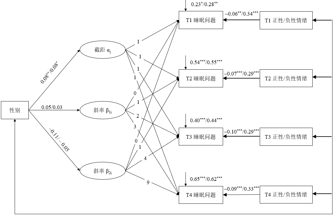 为探讨青少年早期睡眠问题的变化趋势,对睡眠问题分别进行两次建模,选择对数据拟合最好的模型作为最后的分析模型,在此基础上,加入性别这一不随时间变化的因素,考察睡眠问题的发展轨迹是否存在性别差异。最后,分别加入正性情绪和负性情绪,考察不同情绪对青少年早期各测量时间点睡眠问题的影响。结果发现,青少年早期睡眠问题呈曲线递增趋势,递增速度逐渐减缓,在起始水平和发展速度上均表现出显著的个体差异性;在睡眠问题的起始水平上,女生显著高于男生;而且正性情绪可以减缓特定时间点上青少年睡眠问题的发生,而负性情绪增强特定时间点上青少年睡眠问题的发生。