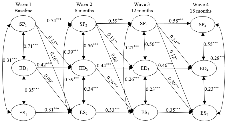 为评估情绪失调在睡眠问题和外化症状之间的作用机制,采用交叉滞后面板模型(Cross-Lagged Panel Model; CLPM)进行全模型检验,结果表明,前期严重的睡眠问题(T1、T2或T3)与青春期后期(T2、T3或T4)较高水平的外化症状密切相关,而前期的外化症状并不能显著预测后期青少年的睡眠问题。此外,情绪失调在青少年睡眠问题与外化症状之间起着显著的纵向中介作用,因此,更严重的睡眠问题导致更多的情绪失调,而情绪失调反过来又导致更多的外化症状,这些研究结果对家庭和中学阶段的教育具有一定的实践意义。