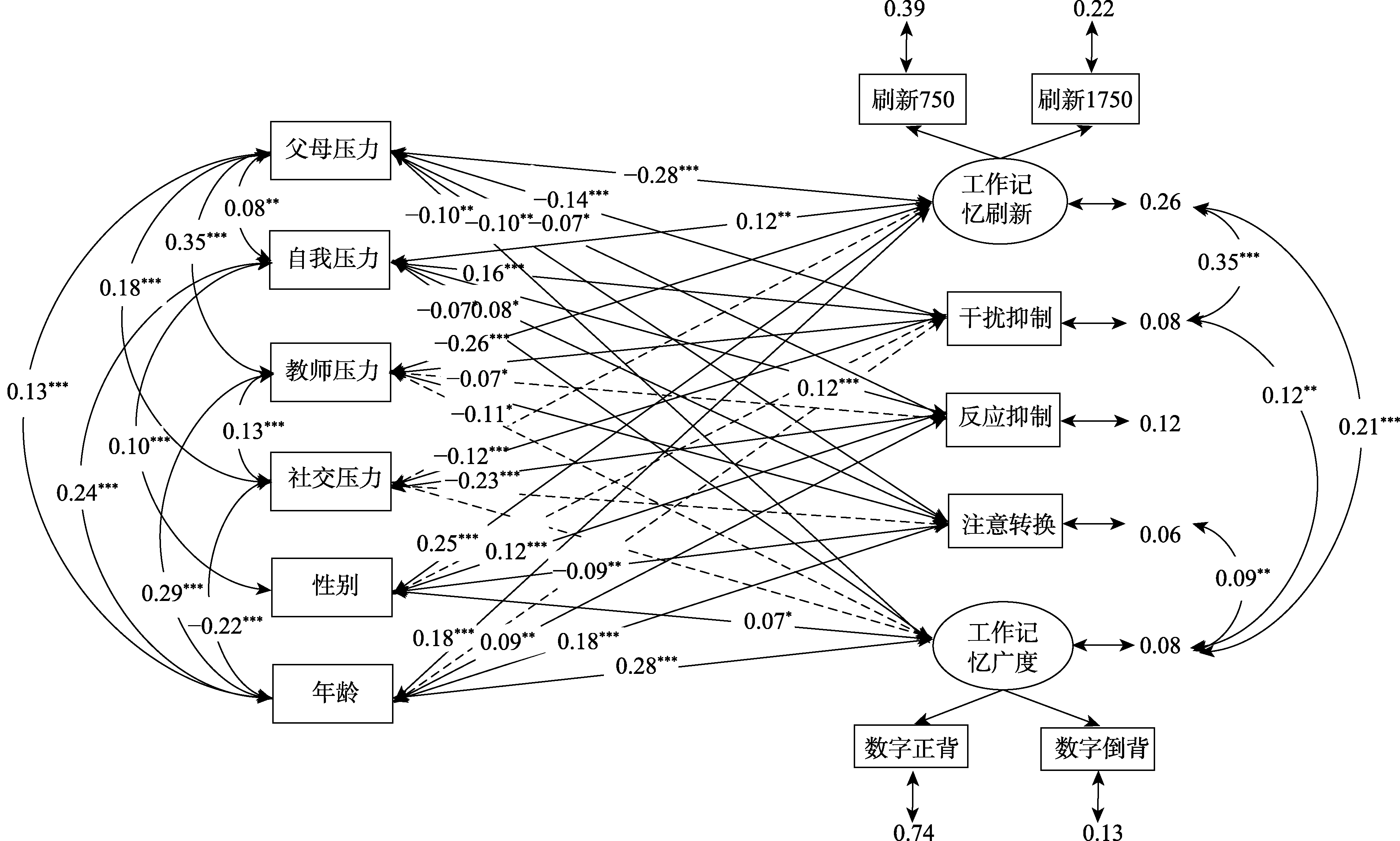 图1 不同类型学业压力与青少年各执行功能成分关系的结构方程模型