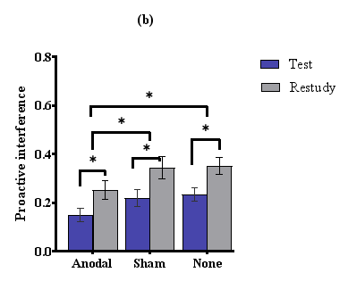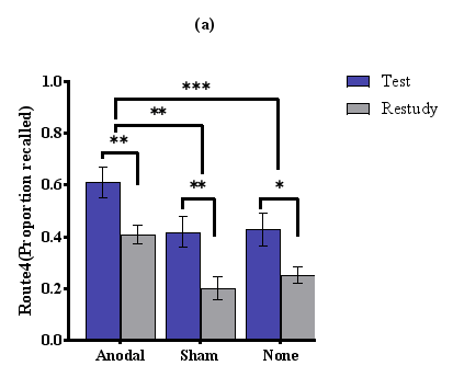 该研究从医院招募了 92 名住院精神分裂症患者,平均年龄35.33岁。根据蒙特利尔认知评估量表 (MoCA) 及阳性和阴性症状量表 (positive and negative syndrome scale, PANSS) 结果,被试首先被随机分配至阳极刺激组、虚假刺激组和无刺激组,每种刺激类型下的被试随后再平均分配至两种学习条件中。刺激电极的放置遵循10-20国际脑电图系统,阳极电极置于F3位置(左侧背外侧前额叶,L-DLPFC),阴极电极置于Fp2位置(右侧眶上区)。刺激强度为2mA,阳极刺激组(Anodal)接受为期5天的 tDCS 治疗,每天2次,每次20分钟,共计10次。虚假组(Sham),与阳极组的刺激位置、刺激时间相同。前后 10 秒的斜坡期外关闭电流。无刺激组,不参与 tDCS 刺激。治疗结束后,采用前置测试的方式学习空间路线。最后对被试在空间路线任务中地标位置顺序记忆的正确率以及因先前学习信息引发的前摄干扰程度进行了比较。