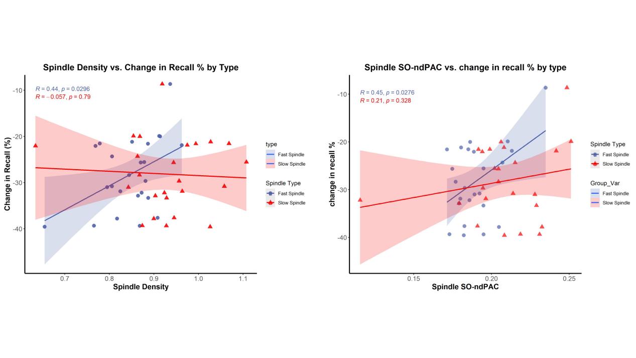 行为结果表明,仅在无反馈提取条件下,午睡组24小时后的记忆衰退率显著低于清醒组,说明睡眠对该类记忆具有稳定作用。脑电分析进一步揭示,无反馈项目的记忆巩固效果与睡眠中快速纺锤波密度及其与慢振荡的跨频耦合强度(ndPAC)呈显著正相关,提示该类神经振荡可能通过促进海马-新皮层对话,支持脆弱记忆痕迹的离线重组和强化。